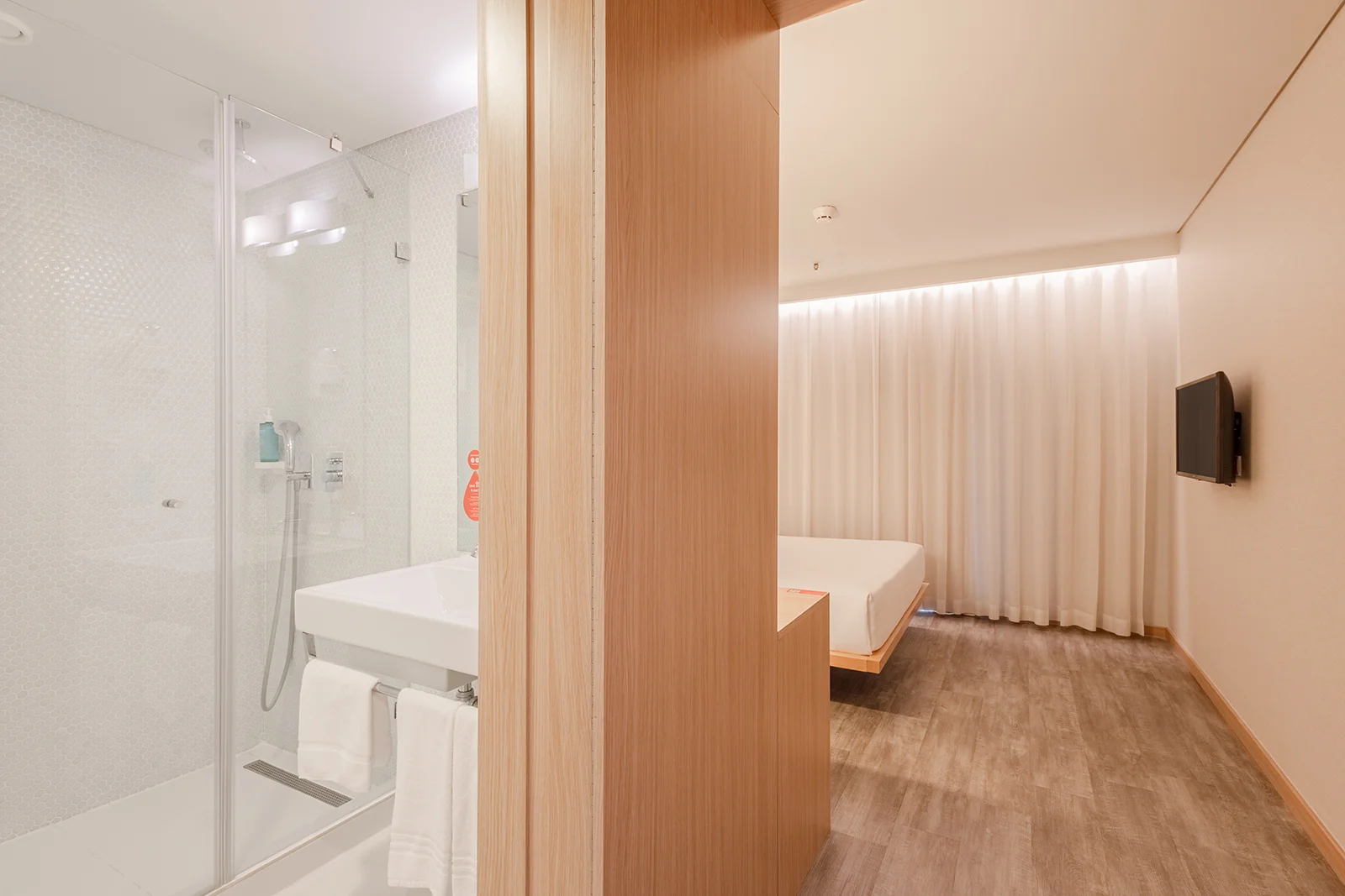 Este quarto climatizado e insonorizado possui uma decoração minimalista, 2 camas individuais juntas, piso de madeira, Smart TV, mesa de trabalho com telefone, cofre e armário.